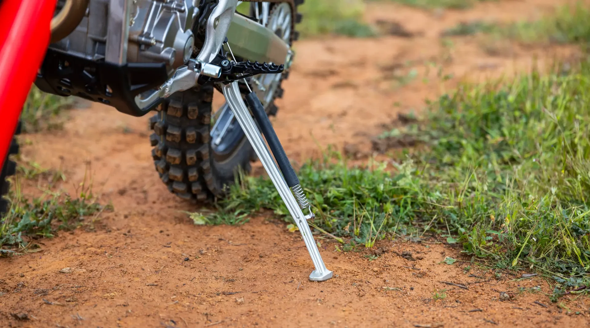 Toda moto de enduro necesita un caballete lateral, y el de la CRF250RX está diseñado para aportar el mínimo peso al conjunto y plegarse cuidadosamente sin interferir en los movimientos de la moto o del piloto.