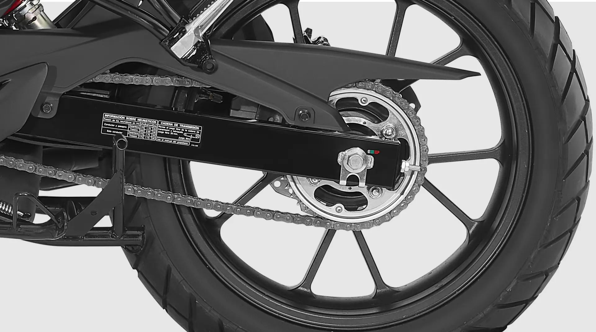 El sistema de frenos cuenta con disco delantero de 256 mm y disco trasero de 220 mm, con pinzas Nissin que aseguran una respuesta progresiva y confiable. El ABS de doble canal optimiza la estabilidad durante el frenado, ayudando a mantener el control de la moto en superficies urbanas y situaciones imprevistas.